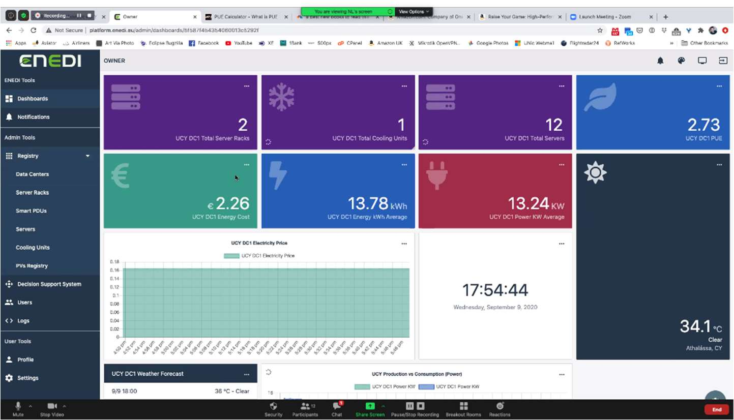 Στην διαδικτυακή ημερίδα μίλησε ο κ. Νικόλας Χατζηγεωργίου (Foss Research Centre for Sustainable Energy – Π. Κύπρου) για τον Σχεδιασμό και την Υλοποίηση Φωτοβολταϊκού Συστήματος, για την Ενεργειακή Αναβάθμιση Κέντρου Δεδομένων και την Ανασκόπηση Αναμενόμενων Αποτελεσμάτων Εξοικονόμησης Ενέργειας. Ο κ. Θανάσης Τρύφωνος (LInC – Π. Κύπρου) παρουσίασε τον Σχεδιασμό και την Υλοποίηση Συστήματος Τηλεμετρίας και τέλος, ο Δρ. Νικόλας Λουλλούδης (LInC – Π. Κύπρου) μίλησε για τον Σχεδιασμό και την Υλοποίηση Συστήματος Παρακολούθησης και Αναλύσεων, παρουσιάζοντας ζωντανά τις λειτουργίες του συστήματος.
